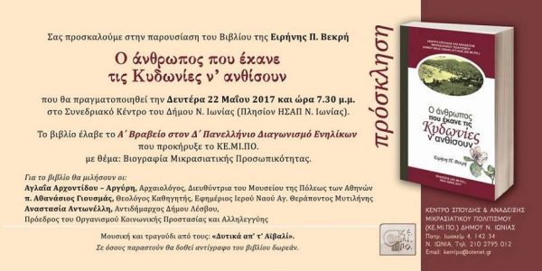 Με χαρά την Δευτέρα 22 Μαίου στις 7:30 μμ παρουσιάζουμε μαζί με την αγαπημένη μας Ειρήνη Βεκρή το βιβλίο της “Ο άνθρωπος που έκανε τις Κυδωνίες ν’ ανθίσουν” Σας περιμένουμε στο Κέντρο Σπουδής και Ανάδειξης Μικρασιατικού Πολιτισμού (ΚΕΜΙΠΟ)