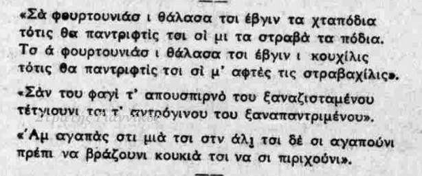 Read More«Στην Αγιάσο, την Καθαρή Δευτέρα γίνονται κάτι «άχρεια» πράματα, μια εκδήλωση κορυβαντική, όπου όλο το χωριό, γυναίκες (οι γνωστές βρακούσες παλιότερα) και άντρες, κατεβαίνουν στη ρούγα και μες σε μια ατμόσφαιρα οργιαστική, πίνουν, χορεύουν και αντιπαλεύουν με στίχους, βγάζοντας το άχτι τους χωρίς φραστικό χαλινάρι…» Ασημάκης Πανσέληνος Λάτι να του τρίψουμι του αντέτ’ να ποίσουμι. Πάριτι τ’ς γ’δουχέρ’ στου χέρ’ λάτι α τρίψουμι πιπέρ’. Γοι γ’δουχέρ’ είνι μιγάλ’ τσ’ έχιν άγαρμπου τσιφάλ’. Μέσ’ τα γ’διά σας δε χουρούν να τατσίσιν δε μπουρούν. Ωχ, μανούλα μ’, πάγ’ του γ’δέλι μ’ τρύπ’σι…