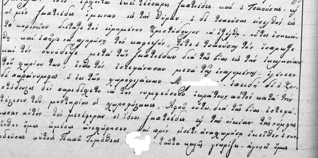 Προ έτους και πλέον ενώ Ο Χριστόδουλος …. εκάθητο εις το καφενείον επήγαν εκεί τέσσερες χωροφύλακες και ο Τσαούσης του χωρίου, συνοδευόμενος και υπό του παπά Σωτηρίου ως προσεκάλεσαν αυτόν (Χριστόδουλον …) να εξέλθη, επειδή όμως ούτος δεν υπήκουσεν ο Τσαούσης τον έσυρεν. Επειδή όμως και πάλιν δεν εσηκόνετο οι χωροφύλακες τον εκτύπησαν δυο τρεις φοράς με τους κοπάνους των όπλων τους. Ούτω λοιπόν εν συνοδεία μετέφερον αυτόν εις την εκκλησίαν του χωρίου των, ένθα τον ενύμφευσαν δια της βίας με την Διαμάντην ….. . Ότε ετελείτο το μυστήριον . Ο Χριστόδουλος , επειδή δεν παρεδέχετο ηθέλησε να καθήση, οι ζαπτιέδες όμως και πάλιν τον εκτύπησαν και ούτω ηναγκάσθη να σταθή , παράνυμφος δε εχρησίμευσεν ο εκ των χωροφυλάκων Μπ…….. Μετά την τέλεσιν του μυστηρίου οι χωροφύλακες μετέφερον αυτόν εις την οικίαν της νύμφης, εκείνος όμως έφυγεν εκείθεν, και έκτοτε ουδέποτε μετέβη παρ’ αυτή, όπερ καλώς γνωρίζει, διότι έλεγεν μεν ο κόσμος ότι ο Χριστόδουλος πηγαίνει εις την σύζυγόν του, αλλά ότε ελέγετο τούτο ο Χριστόδουλος ηργάζετο μαζύ με αυτόν και μαζύ εκοιμώντο, συνεπώς γνωρίζει κάλλιστα ότι ο Χριστόδουλος δεν επήγαινεν εις την οικίαν της εναγομένης. Ότε απήγαγον τον Χριστόδουλον εκ του καφενείου ήσαν παρόντες πλείστοι όσοι, εν οίς και ο προακουσθείς μάρτυς Μπ…