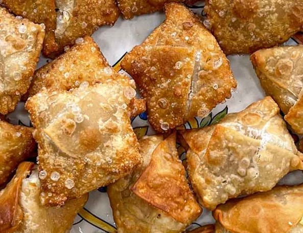 γέμιση γίνεται με ανάλατη φρέσκια μυζήθρα και σερβίρονται με ζάχαρη, μέλι ή