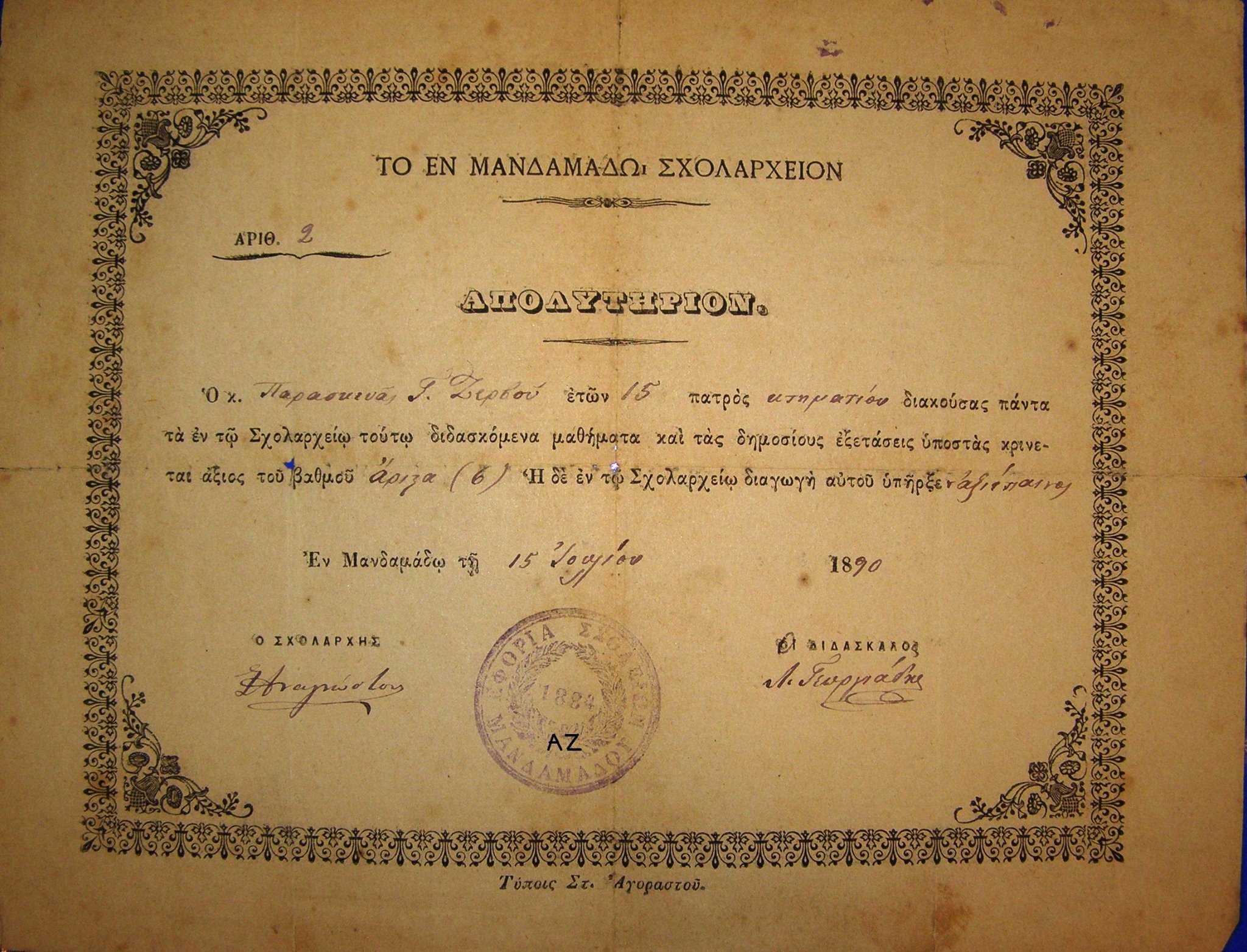 Με την υπογραφή του Σχολάρχη του Μανταμάδου,της Αγίας Παρασκευής, της Καλλονής(Αχυρώνας) και της Συκαμινέας, δασκάλου του Στρατή Μυριβήλη και πρώτου λαογράφου της Λέσβου, Σπύρου Αναγνώστου.